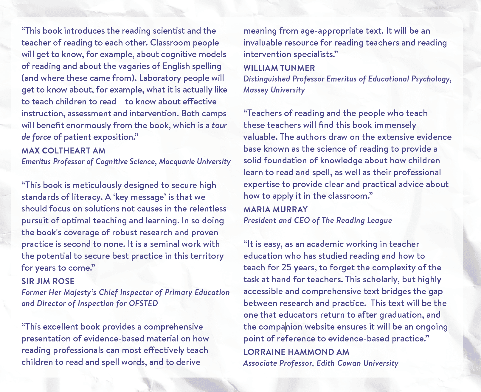 Reading and spelling in English are complex cognitive processes but, thanks to decades of scientific research, a great deal is known about how people learn to read and the most effective teaching methods. This book is based on the literature that comprises the Science of Reading, describing and recommending teaching practices that have the strongest evidence of effectiveness. Its chapters cover evidence-based models, the Five Big Ideas of reading, oral language, spelling, effective instruction and assessment, and how teachers can bring them all together to plan and implement high quality literacy lessons so that all children learn to read and spell.