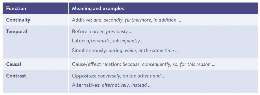 Another type of cohesive tie is a ‘connective’. These words convey how sentences are connected, in order (temporal), in causality, or in agreement (continuity) or disagreement (contrast). The table below lists some connectives and their functions. There is a typical pattern of acquisition: connectives that express continuity and additive relations appear first, followed by temporal connectives, then causal, and finally contrastive connectives. However, consistently appropriate use of connectives continues to develop for several years after they first appear in children’s speech. Development of understanding of connectives develops over a long period of time, with adult levels of mastery not always emerging by the end of primary school.