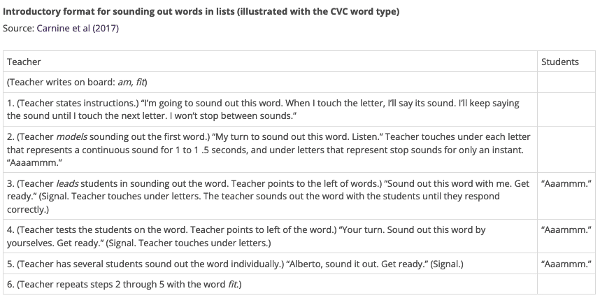 Many published programs do not include specific instructions for teachers to explicitly teach students how to sound out words by blending. Carnine et al (2017) includes an introductory format for this so that teaching this critical concept is not left to chance. Further examples of how to teach blending and segmenting can be found in the Letters and Sounds – Phase 2 materials.