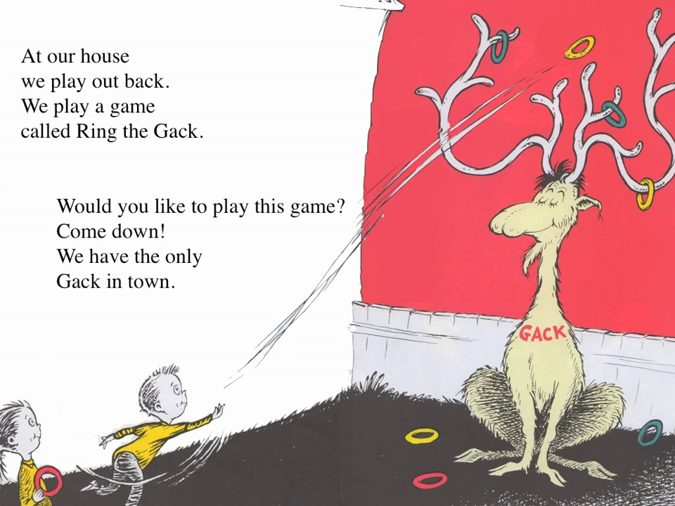 Consider the words in the book, “Fox in Socks” by Dr Seuss. Readers can use their knowledge of grapheme-phoneme correspondences and their ability to segment and blend to read new and novel words. The children in this book go out to play with their pet Gack. Knowledge of the sounds represented by g – a – ck and familiarity with the word ‘back’ help them to read this new word. The book contains other made up pets such as a Zans, a ying, a gox, a yink, and even a pet zeep. Children may have never encountered these words before yet they can read and pronounce the names of these creatures when they apply phonological decoding skills.