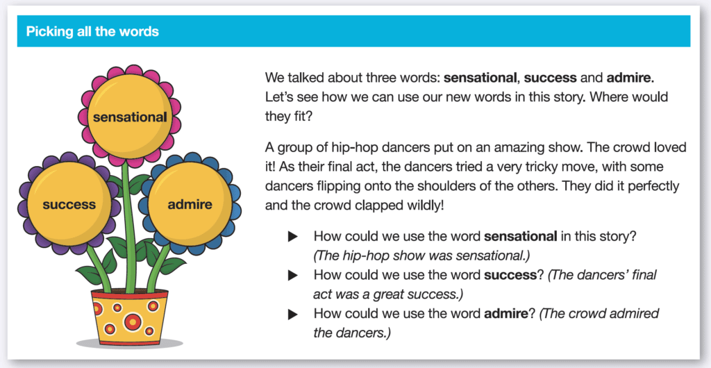 Create a simple story and ask children to work on improving it by applying target words to the relevant contexts. This can be done orally or as a written task, as a class, in pairs or independently as teachers gradually release responsibility. Older or more capable students can be asked to generate their own short connected texts using